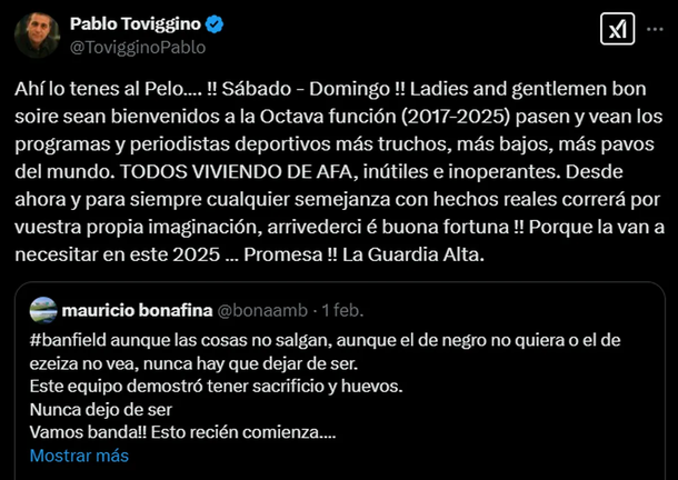 Días atrás, el dirigente de la AFA había publicado un sugestivo mensaje en redes dirigido a Banfield: «Desde ahora y para siempre, cualquier semejanza con hechos reales correrá por vuestra propia imaginación. Buena suerte, porque la van a necesitar en este 2025».