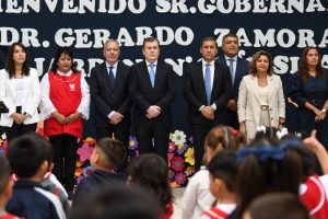 El mandatario estuvo acompañado por el Vicegobernador Carlos Silva Neder; el Jefe de Gabinete, Elías Suárez; los Ministros de Educación, Mariela Nassif, y de Obras Públicas, Aldo Hid; el Secretario de Obras Públicas, Jorge Zuaín; la Presidente del Consejo General de Educación, María Elena Herrera, y la Intendente de la Capital, Norma Fuentes, quienes fueron recibidos por la Directora Patricia Elizabeth Ibáñez.