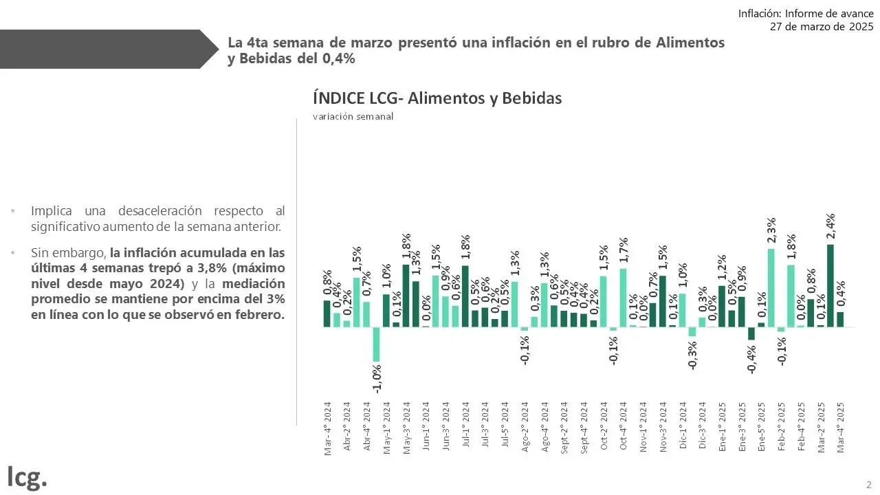 La cuarta semana de marzo presentó una inflación en el rubro de Alimentos y Bebidas del 0,4%, arrojando un acumulado en las últimas cuatro semanas de 3,8%, según la consultora lcg. De esta manera, la inflación promedio de marzo se mantiene en sus máximos desde igual mes del año pasado, aunque la cuarta semana muestre una desaceleración respecto al significativo aumento de la semana anterior (2,4%).