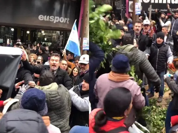 La situación se tornó más tensa cuando los productores comenzaron a arrojar hojas de yerba sobre los militantes libertarios, lo que desencadenó insultos, empujones y una escena de caos que obligó a la intervención de agentes de seguridad.