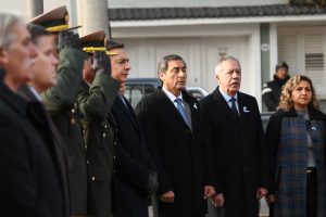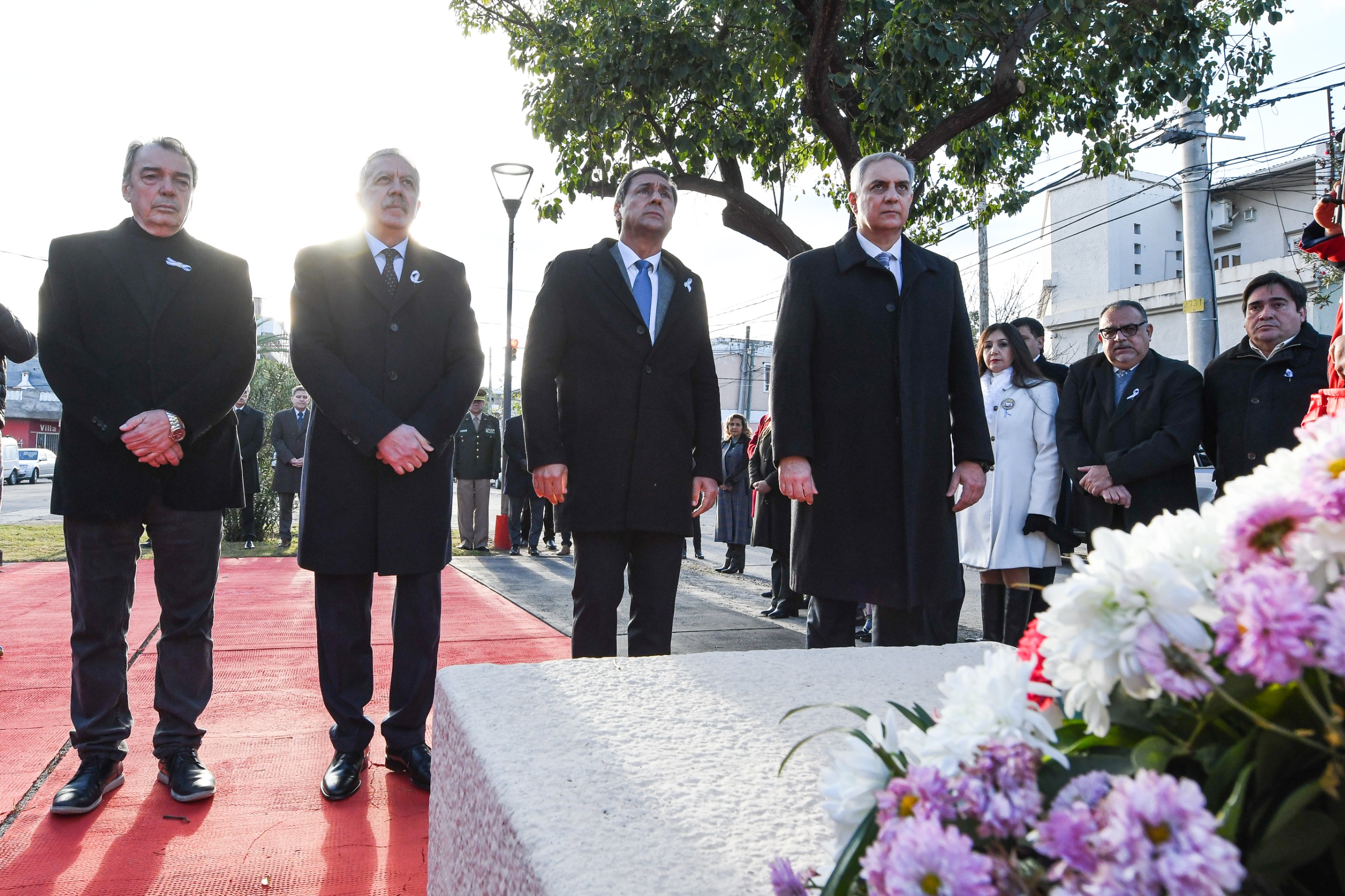 Tras el izamiento de banderas y del Himno Nacional Argentino, se colocaron ofrendas florales.