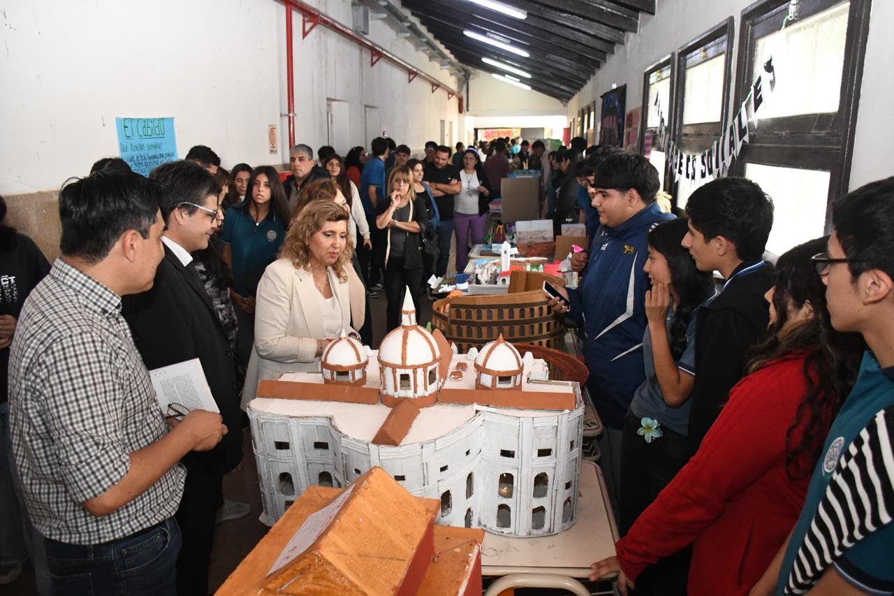 La jefa comunal recorrió junto al Director, Gustavo Paz, los stands ubicados en el patio de talleres y galerías del establecimiento, donde los alumnos exhibieron sus proyectos, maquetas y experiencias educativas desarrolladas durante el año.