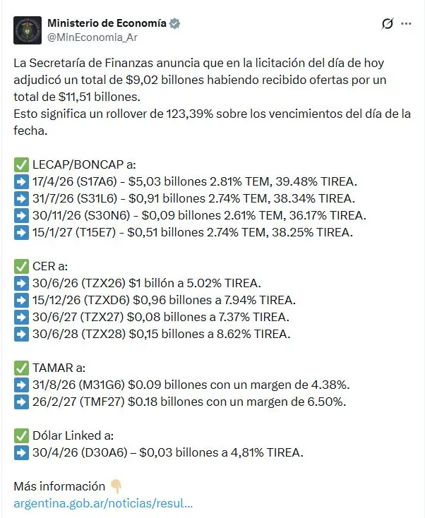 los pesos que obtienen los inversores por esas liquidaciones y que deberían ser destinados a financiar actividades productivas y fondear al sistema financiero para otorgar créditos, son invertidos en títulos del Tesoro lo que le permitió a Finanzas colocar deuda por 9,02 billones de pesos sin necesidad de pagar premio sobre las tasas que respetaron la que se operaban en el mercado secundario.