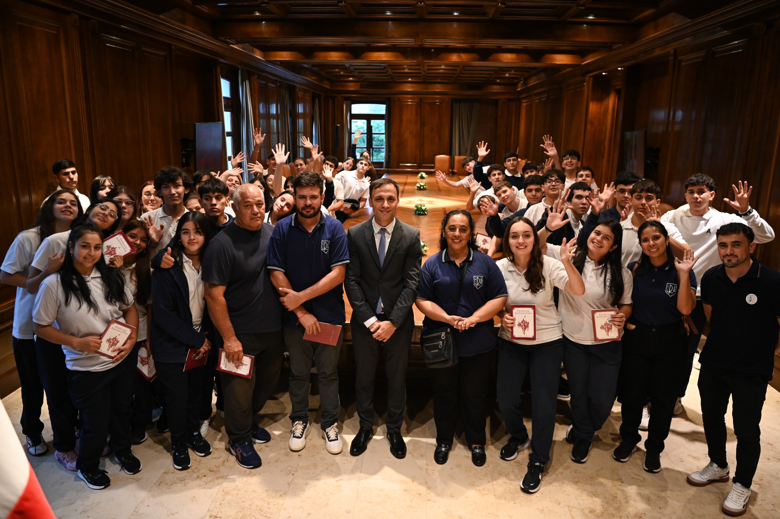 El Gobernador Elías Suárez dio la bienvenida este miércoles en Casa de Gobierno a estudiantes de Secundario de Weisburd, Dpto. Moreno, y del Agrupamiento N° 86.014 de Pozo del Toba, anexo a la Escuela Secundaria de El Colorado, Dpto. Ibarra, quienes forman parte de los primeros contingentes del ciclo 2026 del programa “Conociendo mi provincia” que visitan la ciudad Capital en un recorrido que incluye también a Las Termas y Villa La Punta.