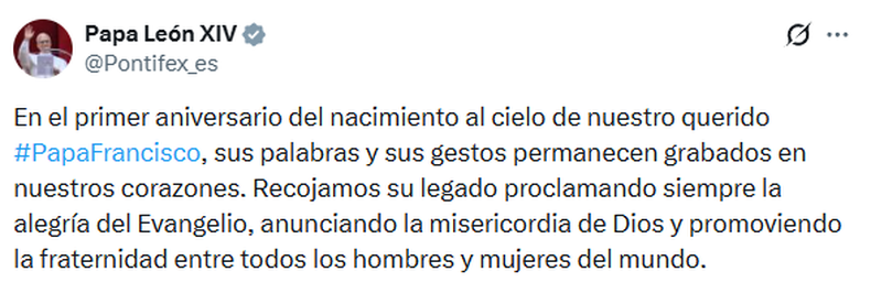 “En el primer aniversario del nacimiento al cielo de nuestro querido Papa Francisco, sus palabras y sus gestos permanecen grabados en nuestros corazones. Recojamos su legado proclamando siempre la alegría del Evangelio, anunciando la misericordia de Dios y promoviendo la fraternidad entre todos los hombres y mujeres del mundo”, expresó León XIV.